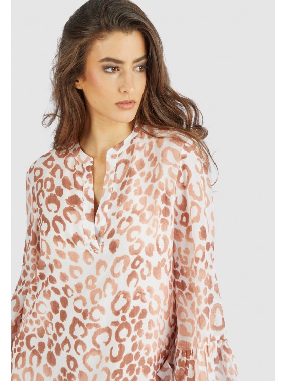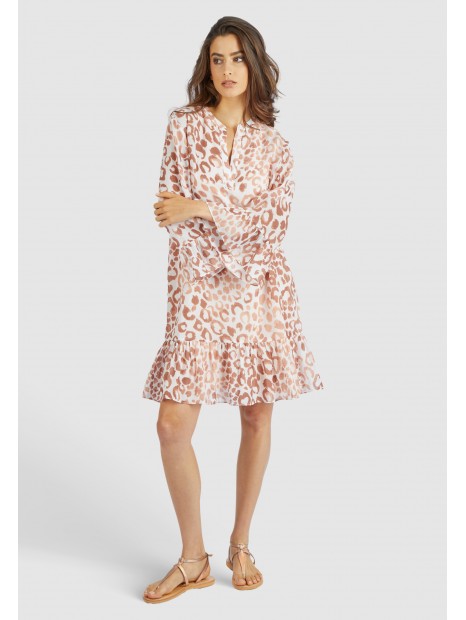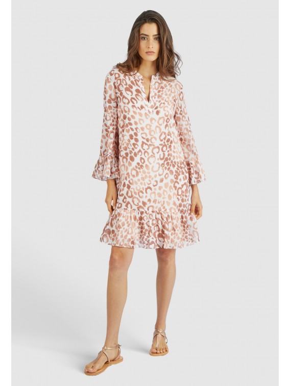 Cette superbe robe à imprimé léopard en fine batiste de viscose de coton ne laisse aucune question sans réponse avec son effet volanté. L'encolure tunique et les manches 3/4 donnent à la robe un petit quelque chose en plus.