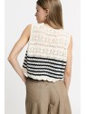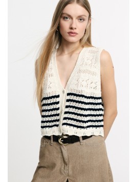 Pull sans manches à découpes ajourées et rayures contrastantes à l'ourlet, avec fermeture boutonnée sur le devant. Parfait pour créer des looks originaux sur t-shirts ou chemises, il apporte une touche unique et polyvalente à vos tenues quotidiennes. Idéal pour jouer avec les associations et exprimer un style vraiment personnel.