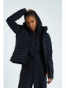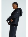 Doudoune sans manches unisexe en nylon glossy. Look puffy avec ses grands boudins, capuche amovible avec cordons intégrés, bas de vêtement élastiqué. Imprimé ton sur ton sur la poitrine.